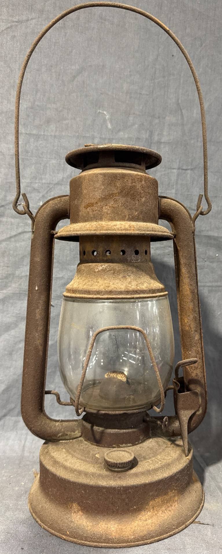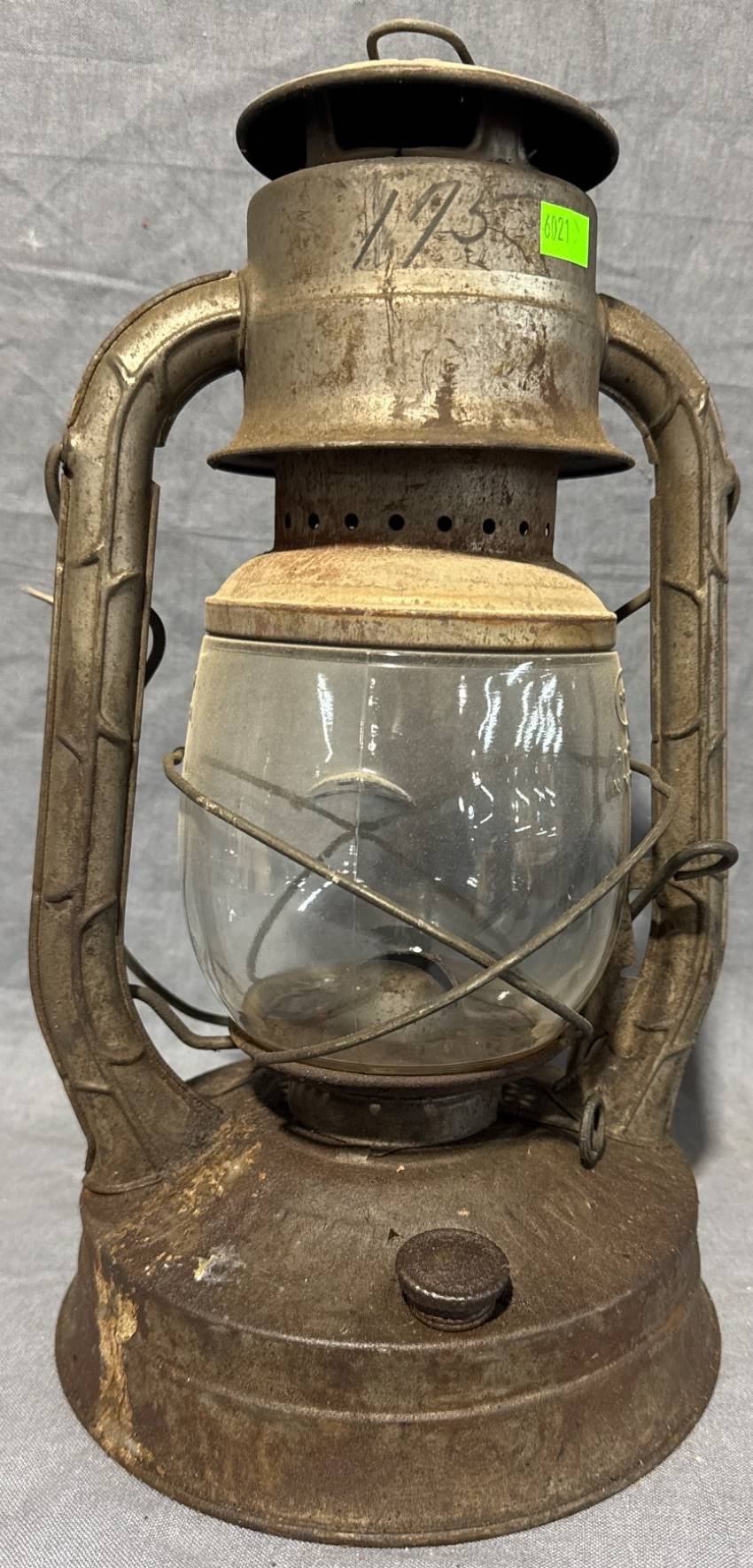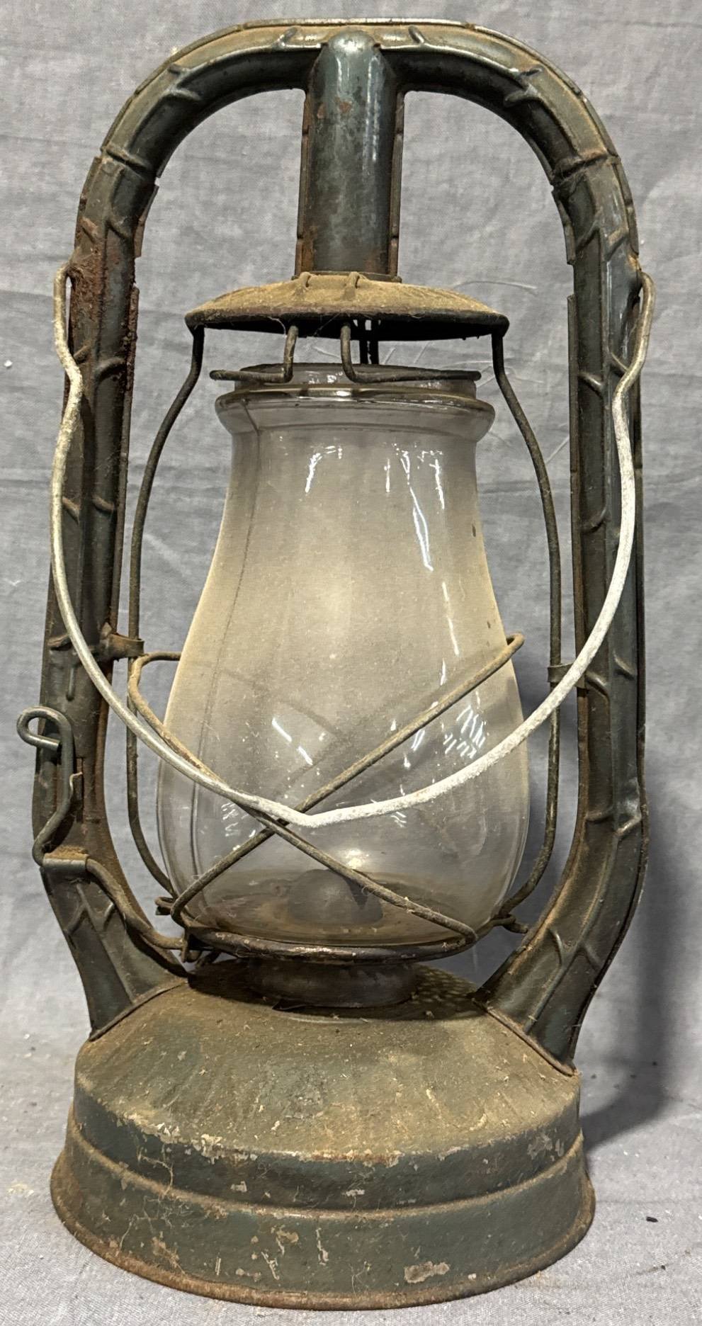 6030 1940s Emerson Metal Kerosene Lantern with Glass Globe and Handle, 14” T