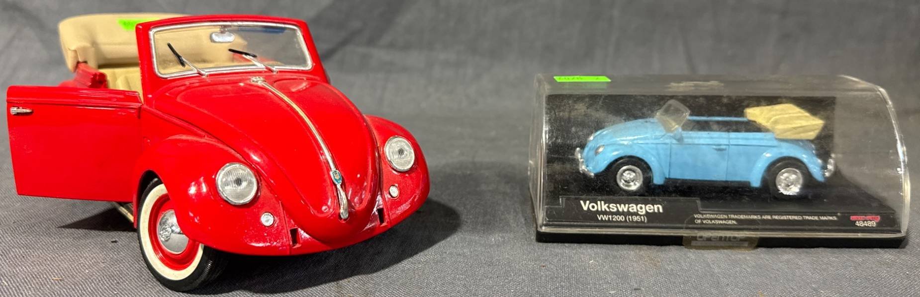 6028 1/18 Scale Red Maisto Volkswagen Convertible and 1/43 Scale 1951 Blue VW 1200, 8.5” and 3.5”
