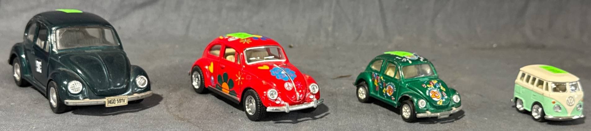 6034 4 Die Cast Volkswagen Vehicles Inc. the Beetle and Classical Bus 2”, 3.25”, 5?, and 5”