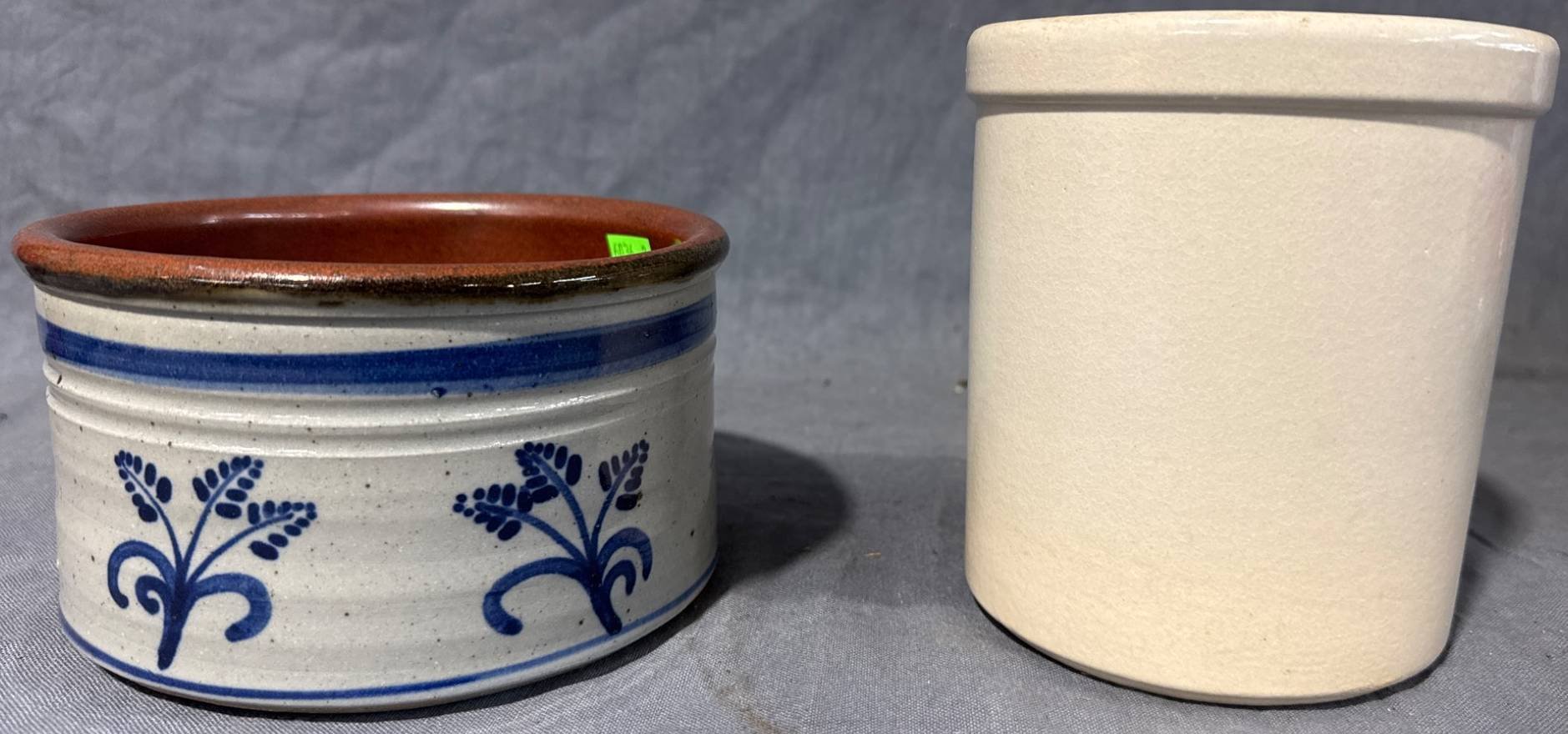 6036 Roseville USA 1 Qt Crock and Handmade Crock with Blue Designs Signed by Artist, 3.5”x5.5”, 5.5”x5”
