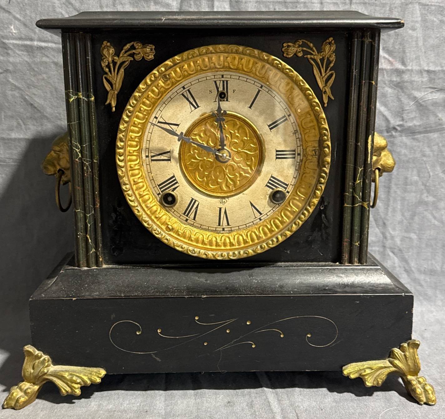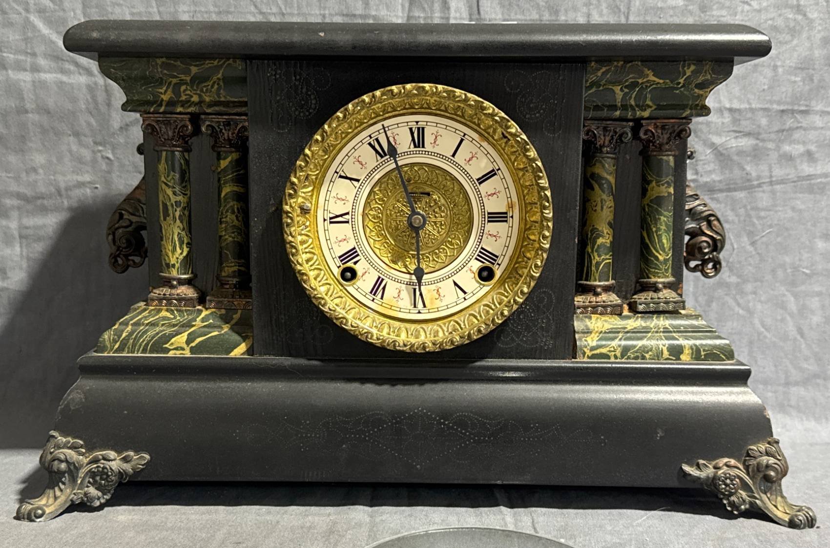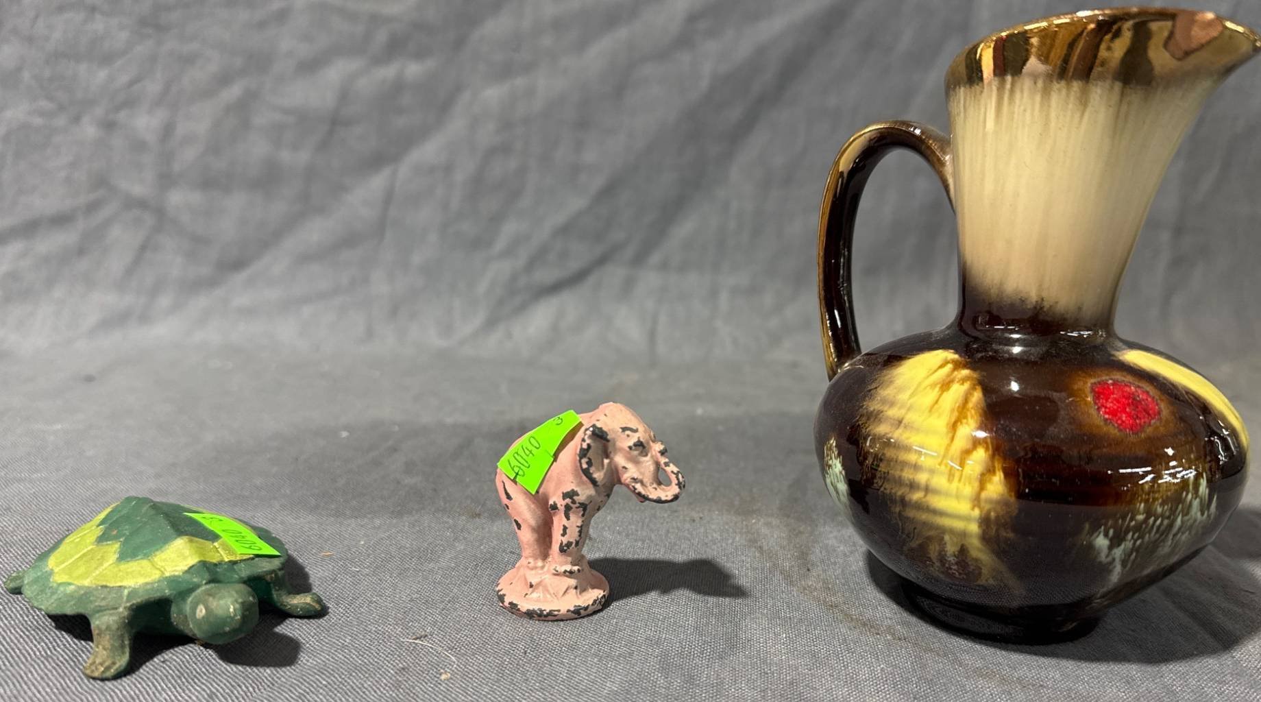 6040 German Pottery Ewer Vase, Painted Pink Iron Elephant Marked ‘Hotel Bristol, N.Y. Pink Elephant Room, and Cast Green Turtle with Hole on Base, 5?, 2?, and 3?