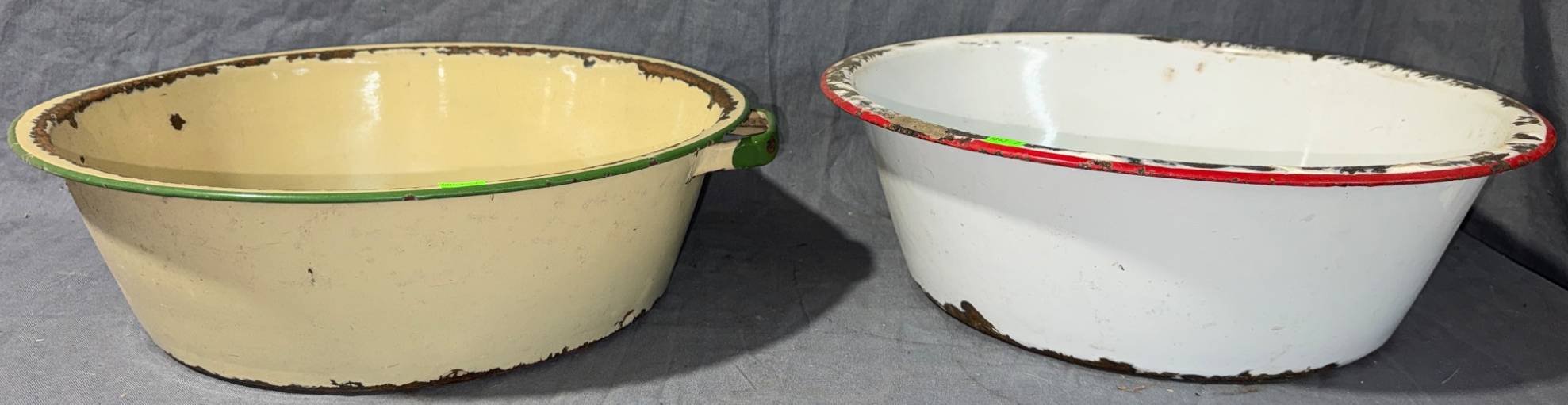 6041 (2) Painted Enamel Bowls, 16.5”x5”, Both with Chips