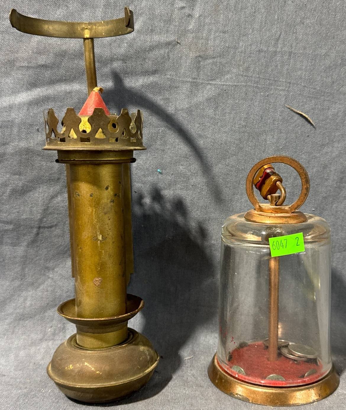 6047 Brass Railway Carriage Candle Lamp by Interpur with Glass Coin Bank with Lock, 9? and 6”