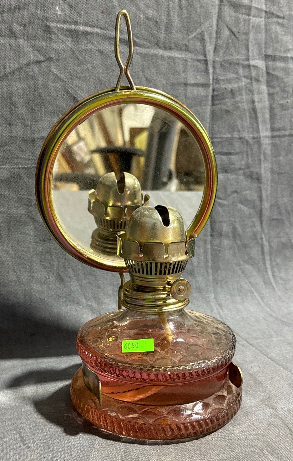 6050 Glass Oil Lamp with Brass Burner and Mirror Attachment, 6”x7”, Contents Unknown