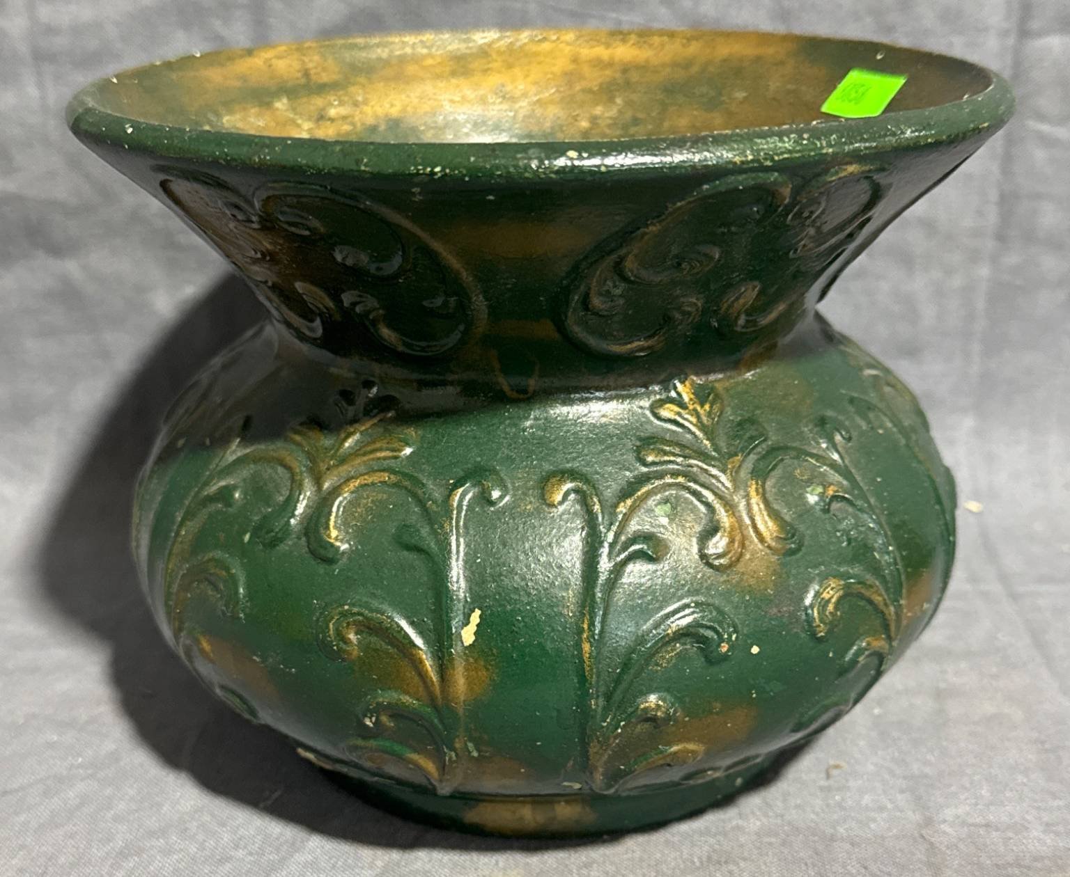 6056 Green Glazed Pottery Spittoon with Floral Motif, 6”x7.5”