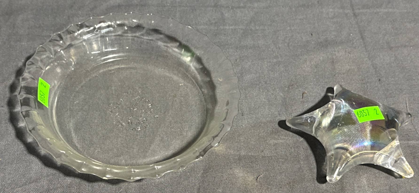 6057 Glass Pie Dish with Scalloped Rim and Starfish Glass Paperweight, 6?, 4”
