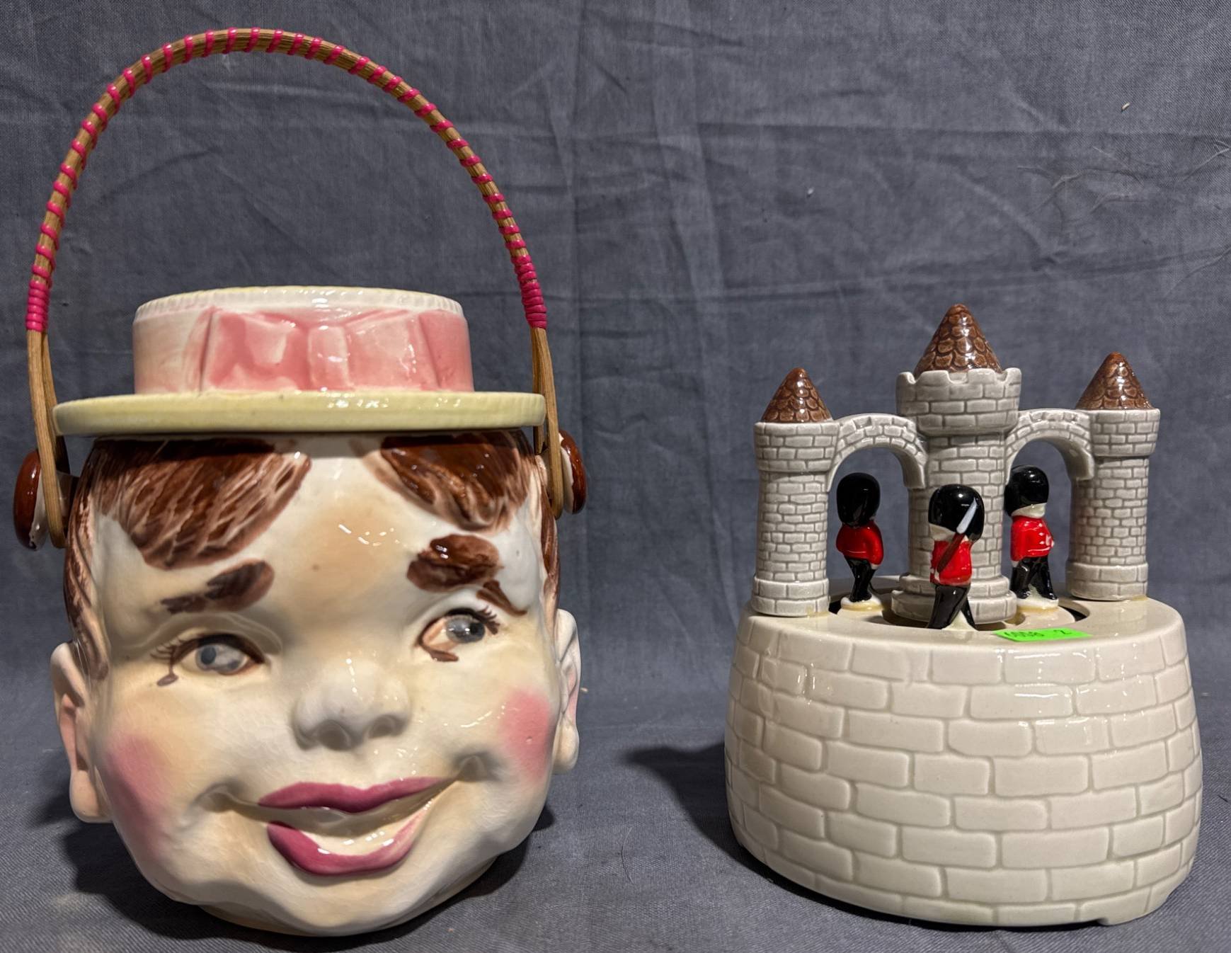 6058 Japan Smiling Boy with Hat Cookie Jar and Otakiri Armed Guards Music Box, 9”, 6”