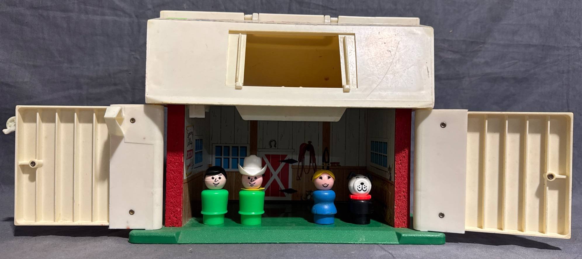 6059 1967 Fisher-Price Play Family Farm Barn Toy, Plastic and Painted Details, 11”x9”x7”