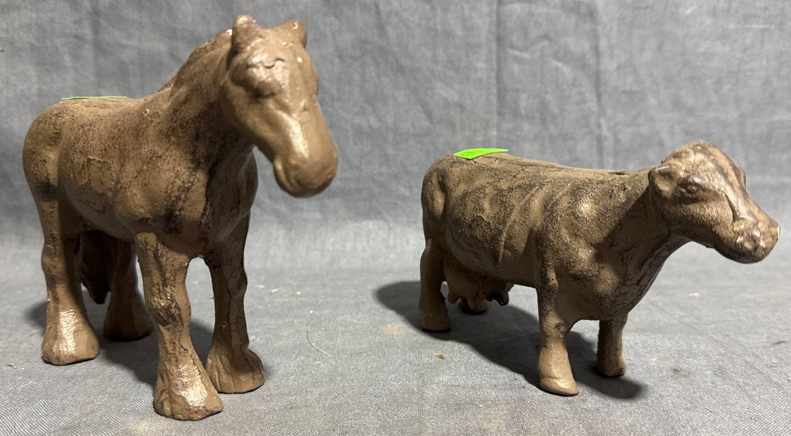6071 Cast Iron Clydesdale Draft Horse and Cow Figurines 5” and 3.5”