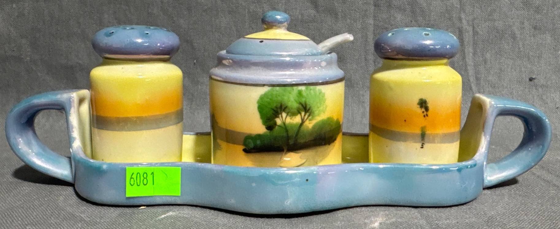 6081 1930s Japanese Lustreware Hand Painted Condiment Set on Tray Featuring Tree and Lake Design, (2) 2.5”, (1) 2”, (1) 9”