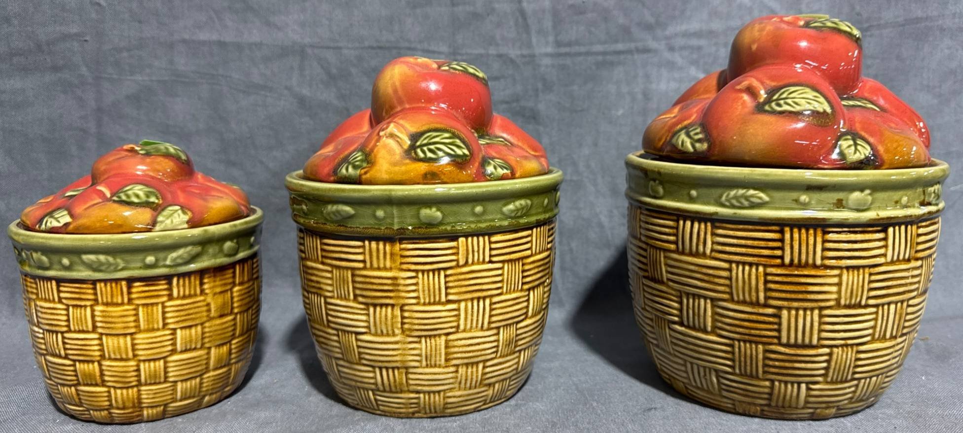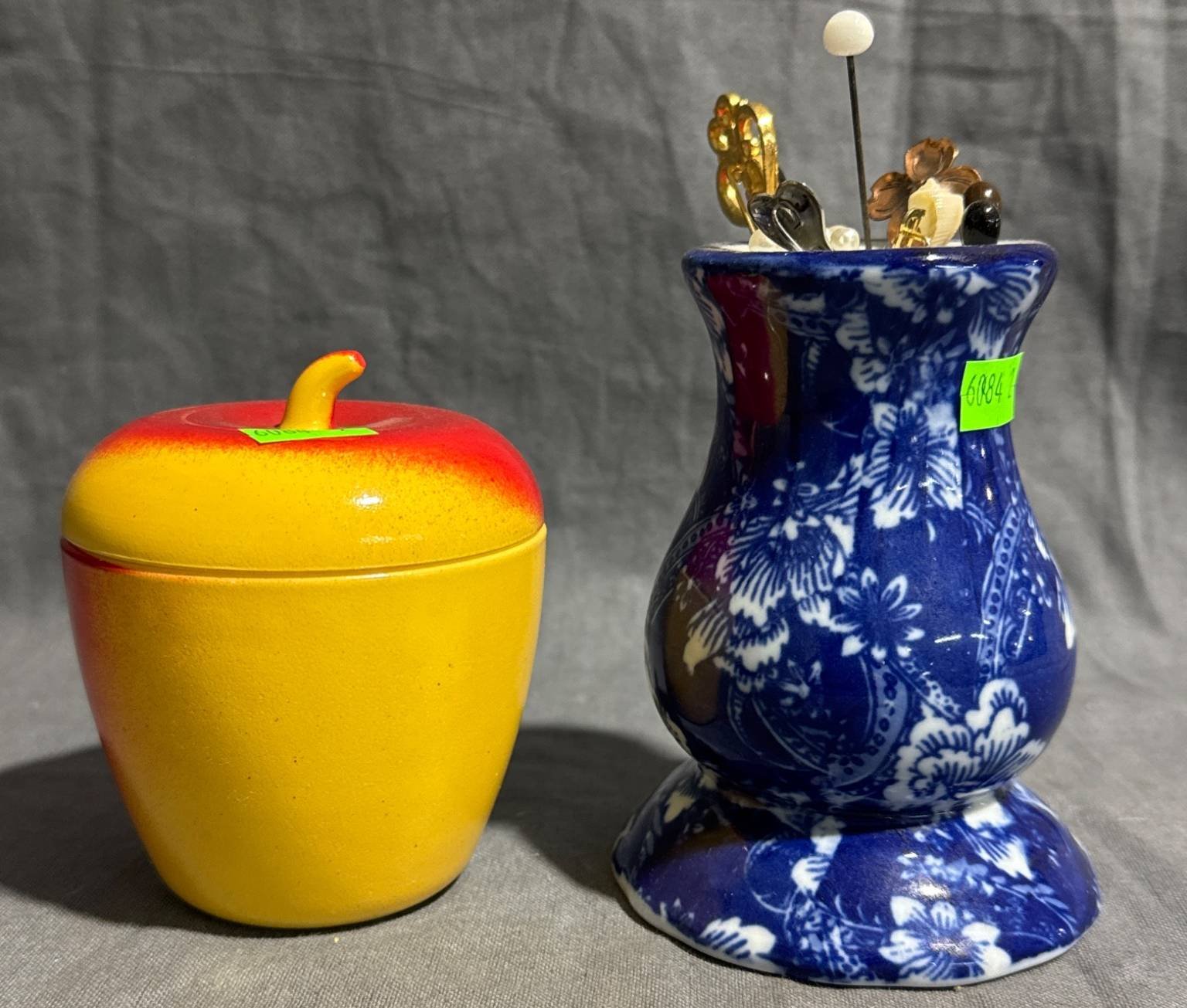 6084 Hazel Atlas Apple Jam Jar 3” & Victoria Ware Ironstone Blue & White Hat Pin Holder 4.5”