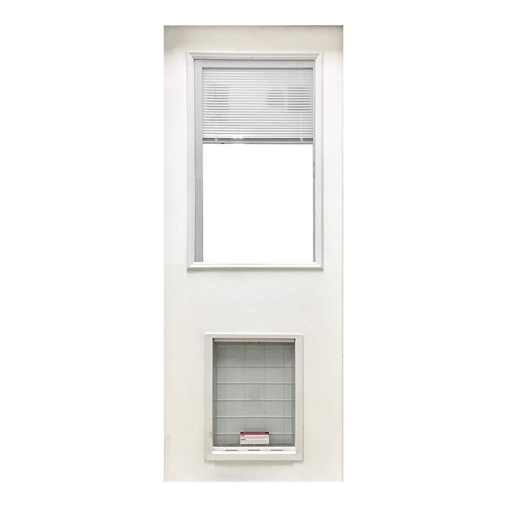 881015 STEVES & SONS - 31-3/4 in. x 79 in. Reliant Clear Half Lite Mini-Blind White Primed Fiberglass Front Door Slab with Extra Large Pet Door