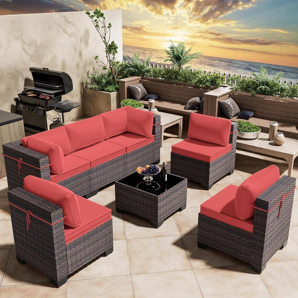 881022 HALMUZ - 7-Piece Wicker Outdoor Sectional Set with Cushion Red
