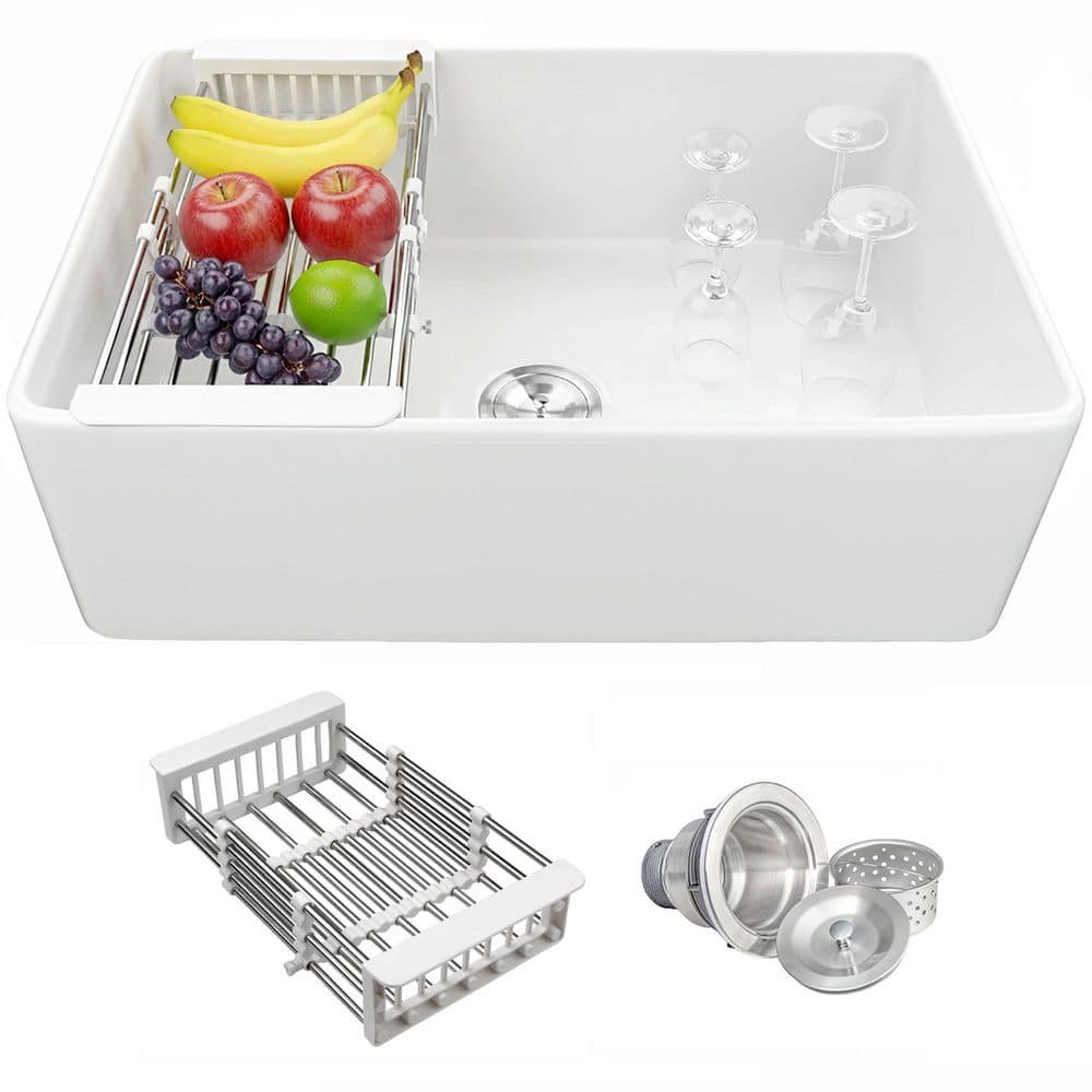881055 AKDY - White Fireclay 30 in. Single Bowl Apron-Front Kitchen Sink with Basket Strainer