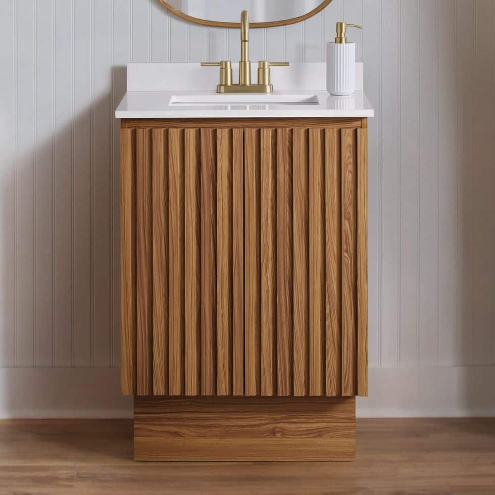 881078 GLACIER BAY - Precine 25 in. Single Sink Natural Teak Bath Vanity with White Engineered Stone Top(Assembled)