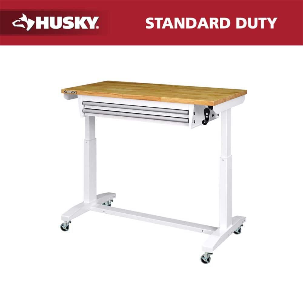 881080 HUSKY - 46 in. W x 24 in. D 2-Drawer Adjustable Height White Worktable with Solid Wood Top