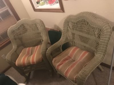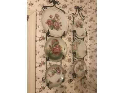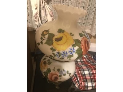 Straight Chairs; Fern Pedestal; Gone w/ Wind Lamp; Glass Compote; Ped. Cake Plate; Hen on Nest; Pressed Glass; Stemware; Set of China; Jewel Tea Pcs.; Hand Painted Porcelain; Cobalt Glass; Set of Rogers Flatware; Prestige Silver Set; Crock; Iron Skillet;